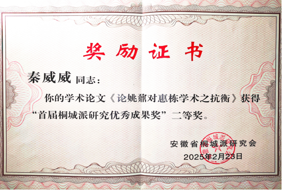 2025年2月23日,安徽省桐城派研究会三届三次理事会议暨首届桐城派研究优秀成果奖颁奖仪式,于桐城圆满举行。开云kaiyun网站新近入职的青年教师秦威威博士,其发表于《安徽大学学报(哲学社会科学版)》的论文《论姚鼐对惠栋学术之抗衡》,荣获桐城派研究优秀成果奖二等奖。安徽省桐城派研究会顾问、南京大学文学院许结教授,亲自为秦威威博士颁发了荣誉证书。