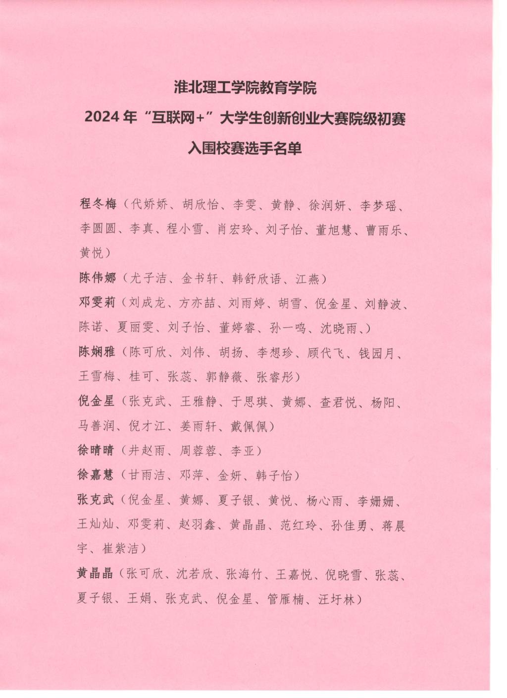 bat365中文官方网站2024年“互联网+”大学生创新创业大赛院级初赛入围校赛选手名单
