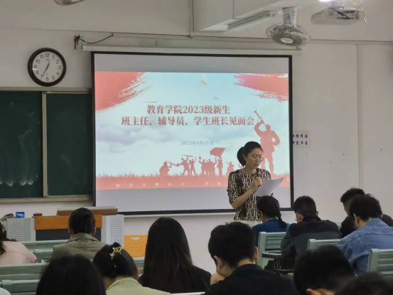 会上,孟向红对全体2023级班主任加入学院的学生管理工作表示欢迎,她阐述了班长、班主任和辅导员在学生日常管理中的作用与各自的分工,强调班主任在学生专业学习指导、学习习惯养成、学业目标职业规划制定等方面的教育引导作用,鼓励班主任老师深入学生班级、多与辅导员交流,努力完成学校交给的任务。