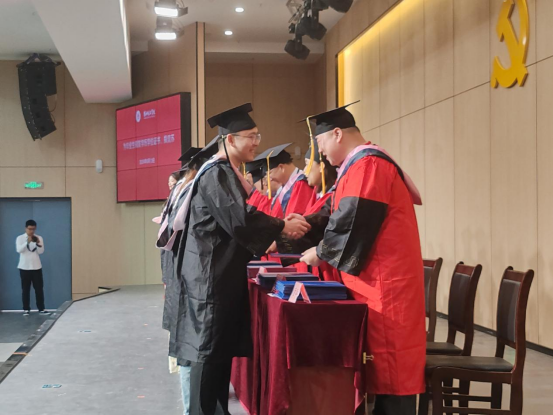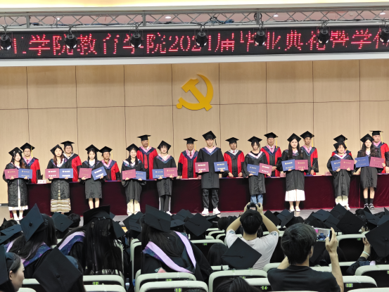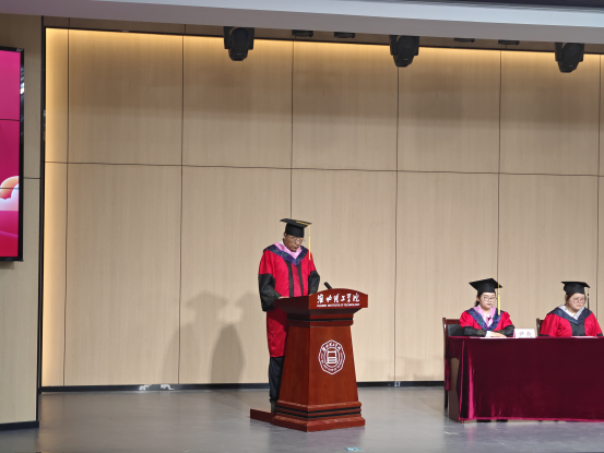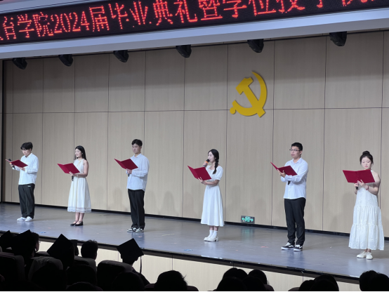 毕业典礼在雄壮的国歌声中拉开帷幕,副院长谢贤德宣读了《bat365中文官方网站2024届本科毕业生学士学位授予决定》后,出席仪式的领导和教研室主任分别为毕业生代表颁发学历、学位证书,并进行拨穗正冠与合影留念。