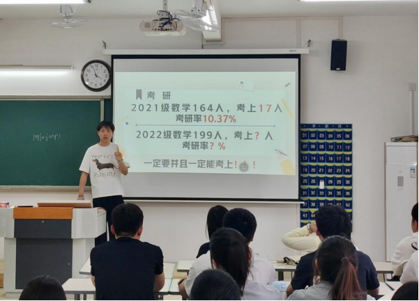 为传承优秀学风,激励学子精准规划职业发展路径,bat365中文官方网站数学专业于5月26日、27日在1号教学楼召开2026届毕业生“考研、征兵动员大会”。会议以“榜样引领方向,奋斗书写青春”为主线,通过总结2025届毕业生升学入伍的出色成绩,为2026届学生锚定目标、明晰方向。全体2026届数学专业毕业生参会,此次会议由数学专业辅导员郭鸿鑫、吴天一分场主持。