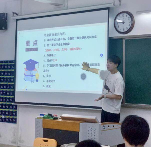 郭鸿鑫老师还结合2025届毕业核查工作,要求2026届毕业生提前做好准备,尤其在第一、第二课堂的学业完成度上,要认真检查自己是否完成了学校规定的学分要求,对尚未达到要求的科目,要及早规划联系任课老师。同时,郭鸿鑫老师对所有学生党员提出要求,要做好考研就业的模范带头作用及同学之间的学业帮扶工作。