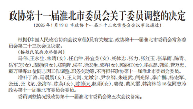 1月19日,经淮北市政协十一届二十三次常委会会议审议通过,bat365英语教研室教师、九三学社社员陈博识增补为政协第十一届淮北市委员会委员。