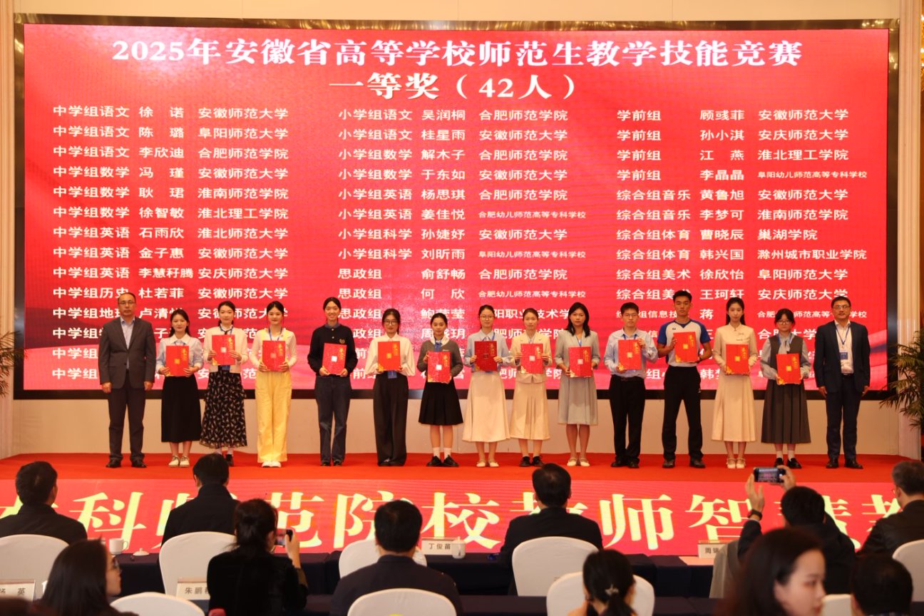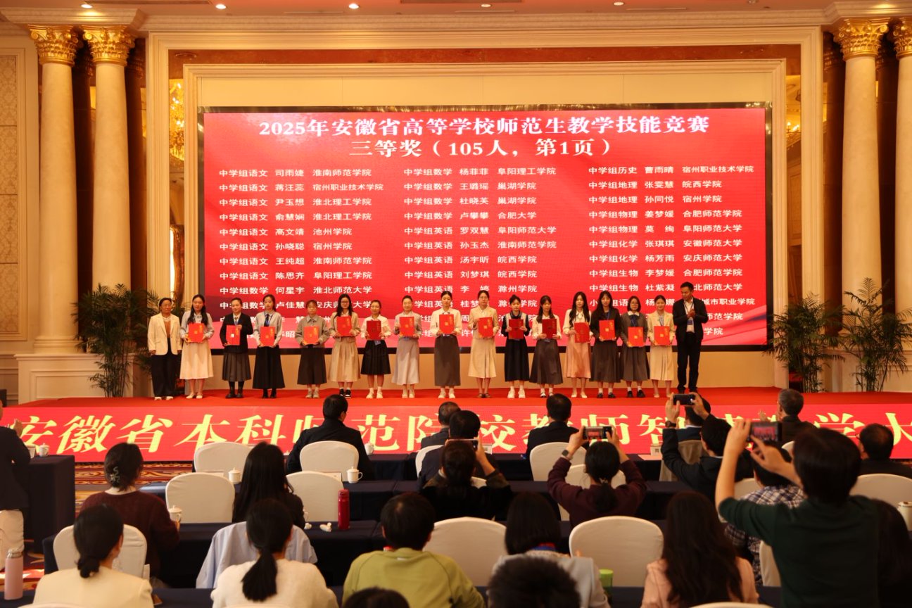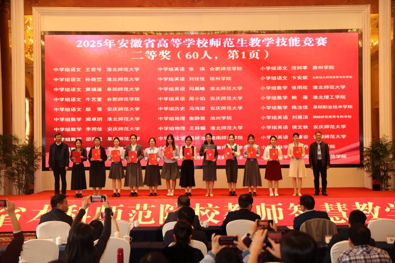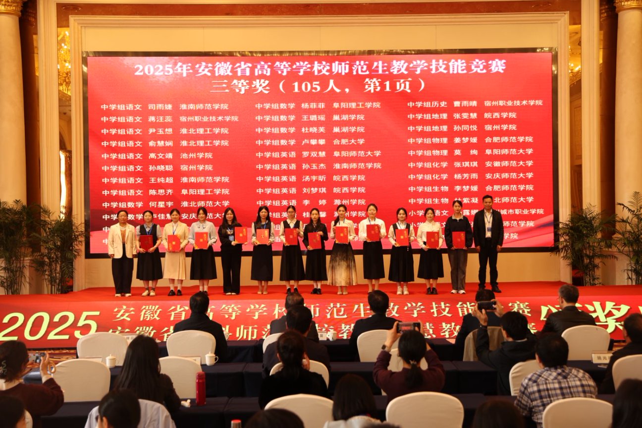 11月2日下午,由安徽省教育厅主办、合肥师范学院承办、安徽省高等院校教师教育合作委员会协办的“2025年安徽省高等学校师范生教学技能大赛”,在合肥师范学院滨湖校区圆满落幕。自7月14日启动筹备至赛事收官,bat365历经111天的层层遴选与精心打磨,推荐13个学生(团队)代表学校出征省赛,最终12个参赛主体成功获奖。其中,一等奖2项、二等奖3项、三等奖6项、优胜奖1项。