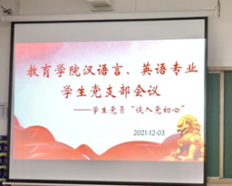 为深入学习贯彻党的十九届六中全会决议精神、学习《中共中央关于党的百年奋斗重大成就和历史经验的决议》,引导全体学生党员在专业学习、组织纪律、活动参与、班级管理、宿舍建设和文化素质提升等方面发挥引领和示范作用,bat365中文官方网站数学与应用数学与学前教育学生支部,和汉语言文学与英语学生支部分别于12月1日下午和12月3日下午在1号教学楼213教室召开支部大会,会议分别由支部书记任若晨和彭慧敏主持,所属支部的学生党员和辅导员老师参加了会议。