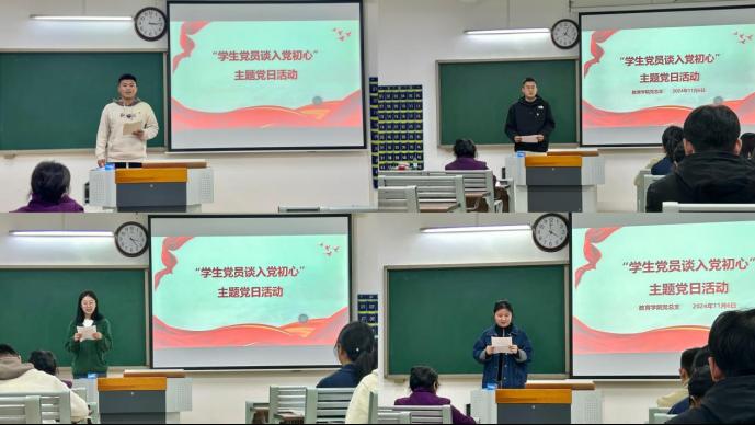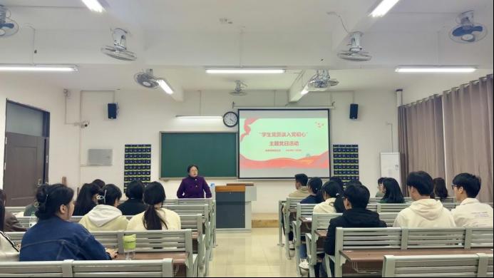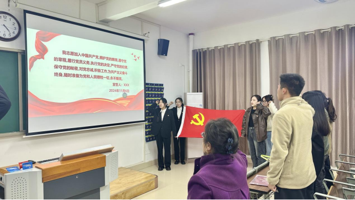 为深入学习贯彻党的二十大精神,引导学生党员在新的学习生活环境中,保持共产党员的先进性,在专业学习、组织纪律、文化素质提升等方面发挥引领和示范作用,自觉做习近平新时代中国特色社会主义思想坚定信仰者和忠实实践者,bat365中文官方网站党总支于2024年11月6日在1教213教室,举行“2024级学生党员谈入党初心”主题党日活动。活动由陈慧慧同志主持,学院党总支副书记孟向红、各学生党支部书记及27名新生班级学生党员参加了活动。