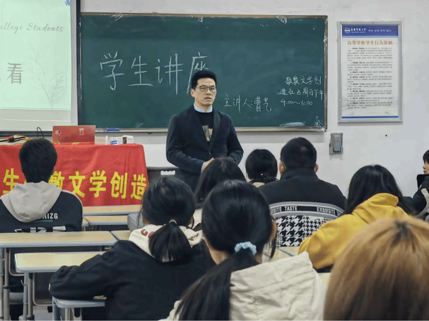 3月17日,大学生敬敷文学创造社在教学楼312室举办了以“《道林·格雷的画像》为艺术而艺术”为主题的第七期学生讲座。讲座由副社长曹艺主讲,指导老师江飞教授莅临现场指导。来自开云kaiyun网站的63位同学参加了本次活动。