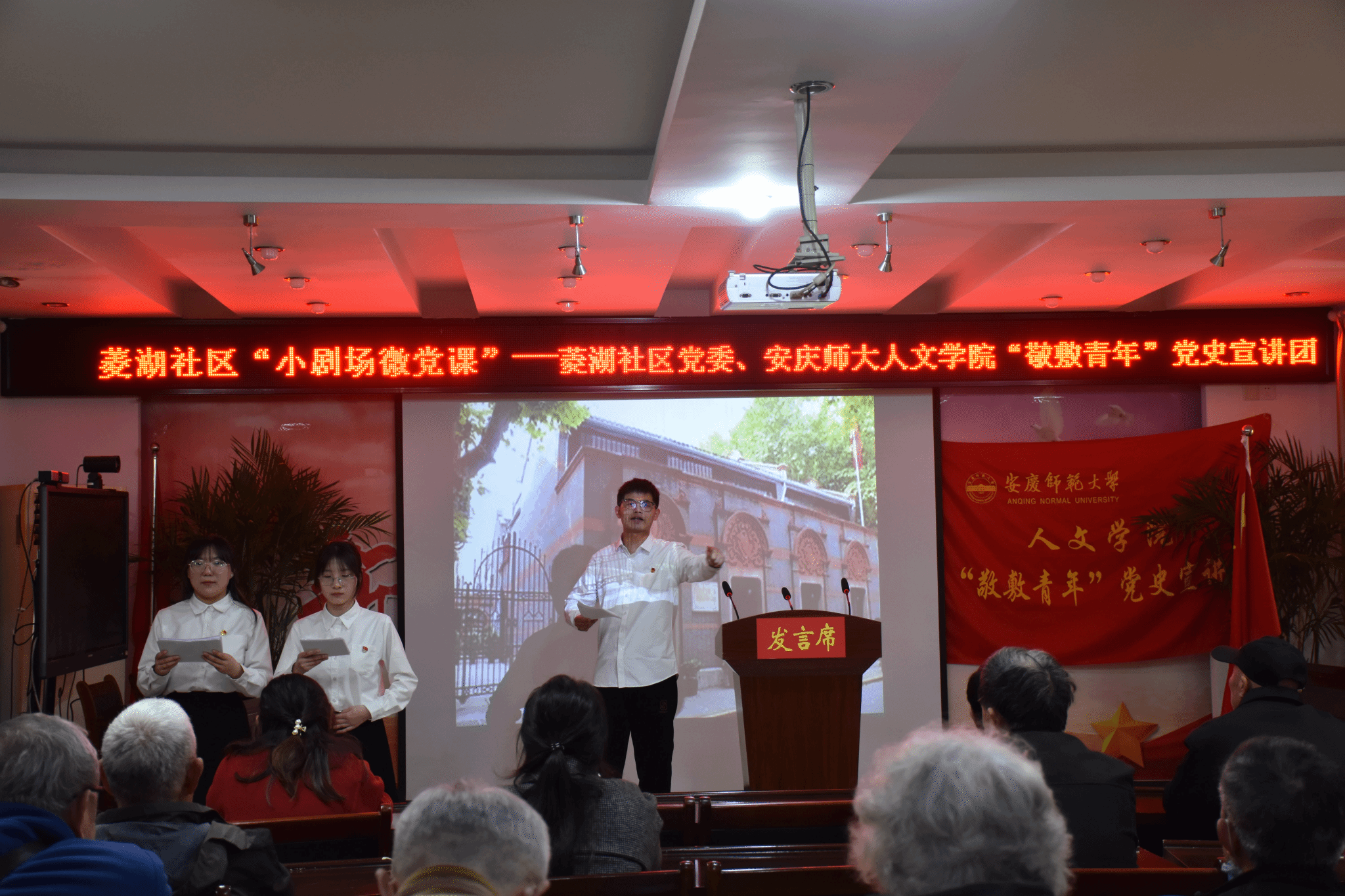 紧接着,宣讲团的成员们从1921年的那条改变中国命运的船讲起,向菱湖社区的老党员讲述了1921年的毛泽东、朝鲜战场上的于树昌和2020年中印边界上的肖思远三位来自不同时空青年的故事。百年间,青年们依旧风华正茂,青春热血播撒在祖国最需要的地方,建设成今天这个强大的中国,岁月因青春慨然以赴而更加静好,世间因少年挺身向前而更加瑰丽。