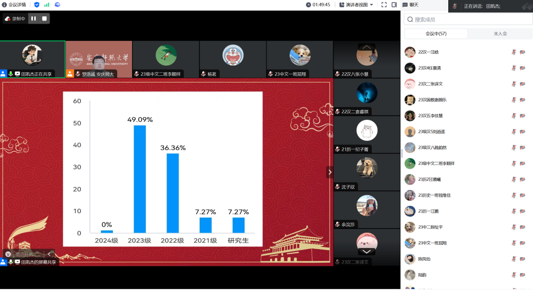 此次交流会以“风物放眼量,落花读华章”为主题,田凯杰深度解读了两句诗的寓意,呼吁大家把理论和实际工作相结合,做好本科阶段应该做到和应当完成的事情,倡导学生积极投身到社会实践之中,获取人生更加长远深刻的进步。