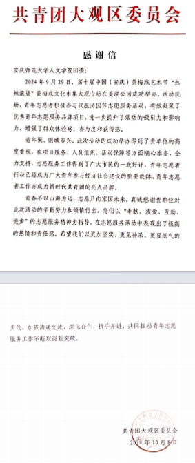 近日,大观区团委致函开云kaiyun网站,对开云青年学生在第十届中国(安庆)黄梅戏艺术节“热辣滚烫”黄梅戏文化市集活动中的志愿服务工作表示赞扬与感谢。