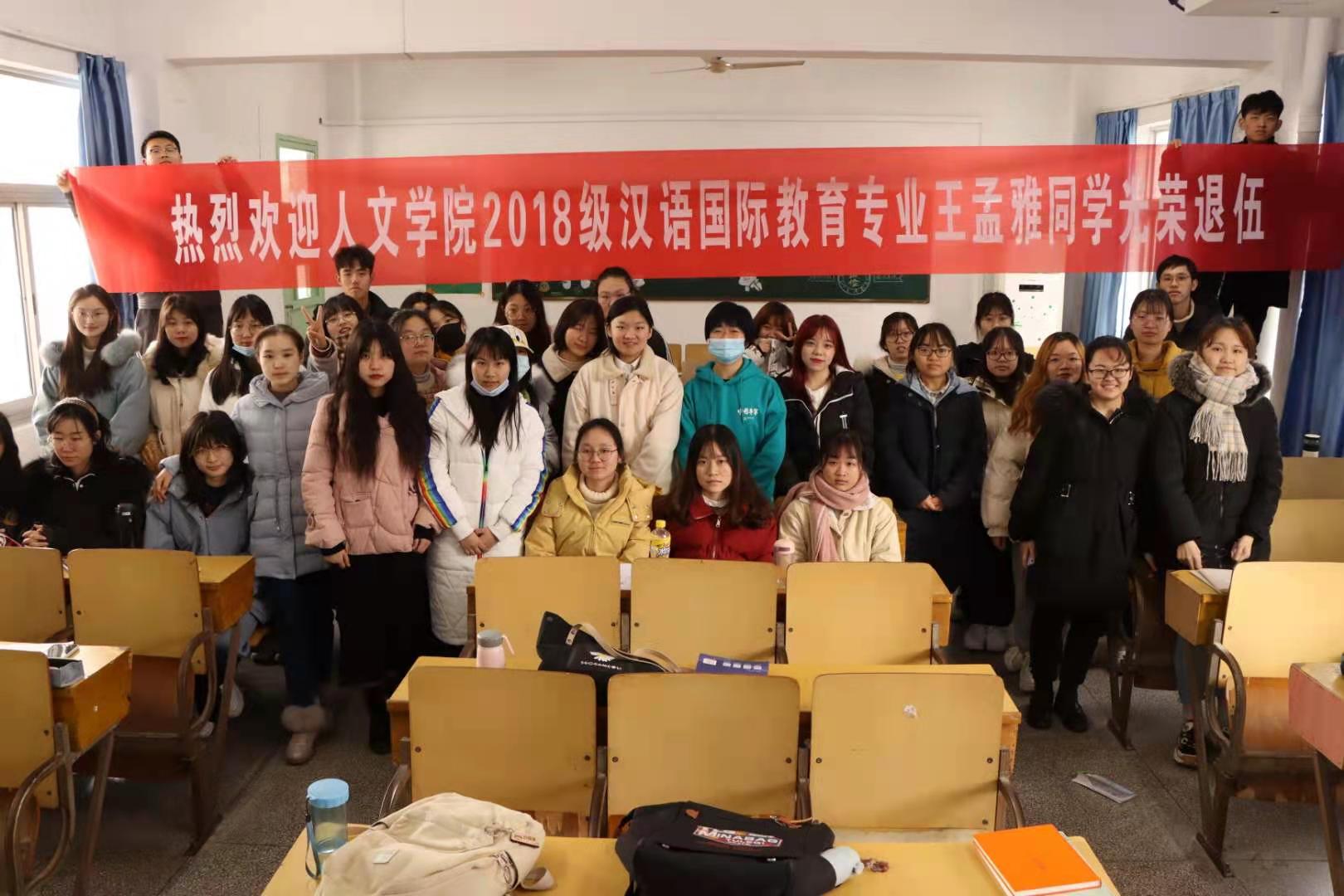 “热烈欢迎开云kaiyun网站2018级汉语国际教育专业王梦雅同学光荣退伍!”1月6日上午,在菱湖校区教学楼310教室,汉语国际教育专业2018级的学生们举办了一场特殊的欢迎会,欢迎刚从南海舰队退伍的王梦雅同学。