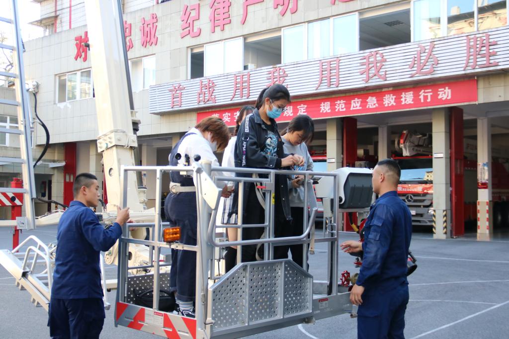 消防员将一辆消防车的云梯启动,组织同学们体验31米的高空灭火环境。大家听后都很激动,跃跃欲试,每四个人为一组,分批次登上了云梯。“这个云梯升的好高啊”“这个看起来有点可怕呀,上面体验的人不害怕吗?”在下面观看的同学发出这样的感叹。2019级汉语言文学二班的吴婷体验之后说:“第一次登上云梯,觉得很新奇。有了这个云梯后,高空火灾被困人员就容易被救出来,降低了消防工作的危险程度。”