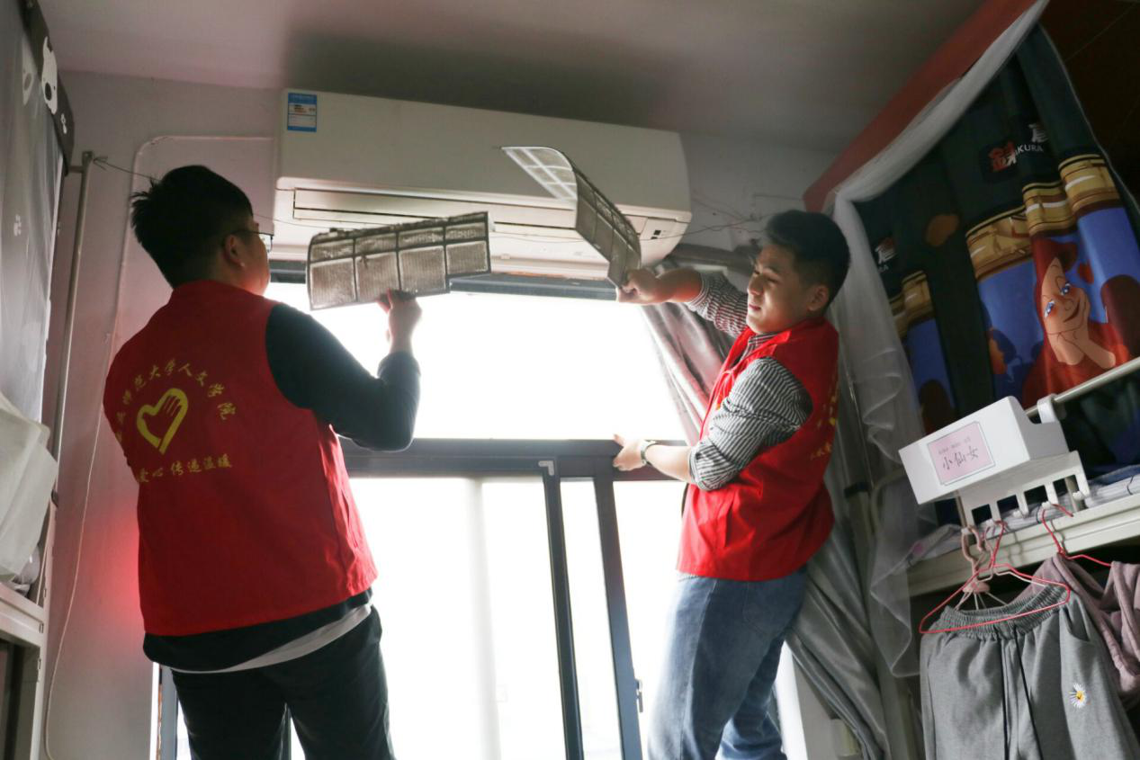 下午两点,从各班招募到的58名学生整齐地穿戴好红色志愿者服,开始他们的志愿服务。随后,在学生会工作人员的统一带领下,志愿者团队分两人一组进入了提前分配好的宿舍。空调断电、扶稳椅子、拆卸外壳、抽出滤网……志愿者们不辞辛劳,在不同的寝室内重复着相同的动作。最后,他们又帮助各寝室将清洗烘干后的过滤网重新安放至空调内。