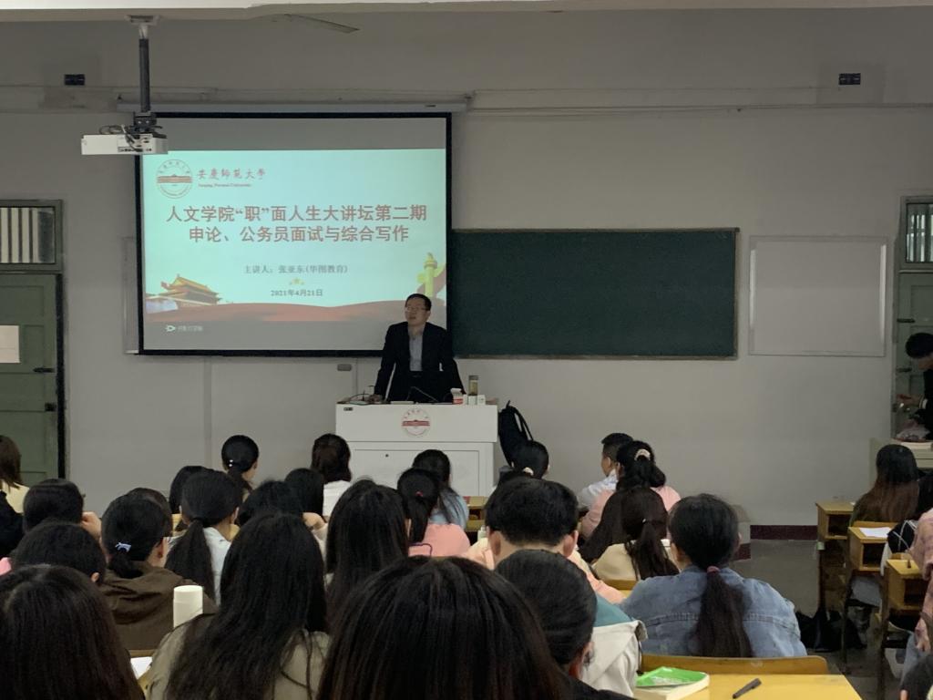 4月21日下午,开云kaiyun网站“职”面人生大讲坛第二期——“申论、公务员面试与综合写作”在教学楼214教室举行。华图教育专职老师张亚东受邀担任主讲,开云kaiyun网站各专业本科生一百余名学生参加讲座。