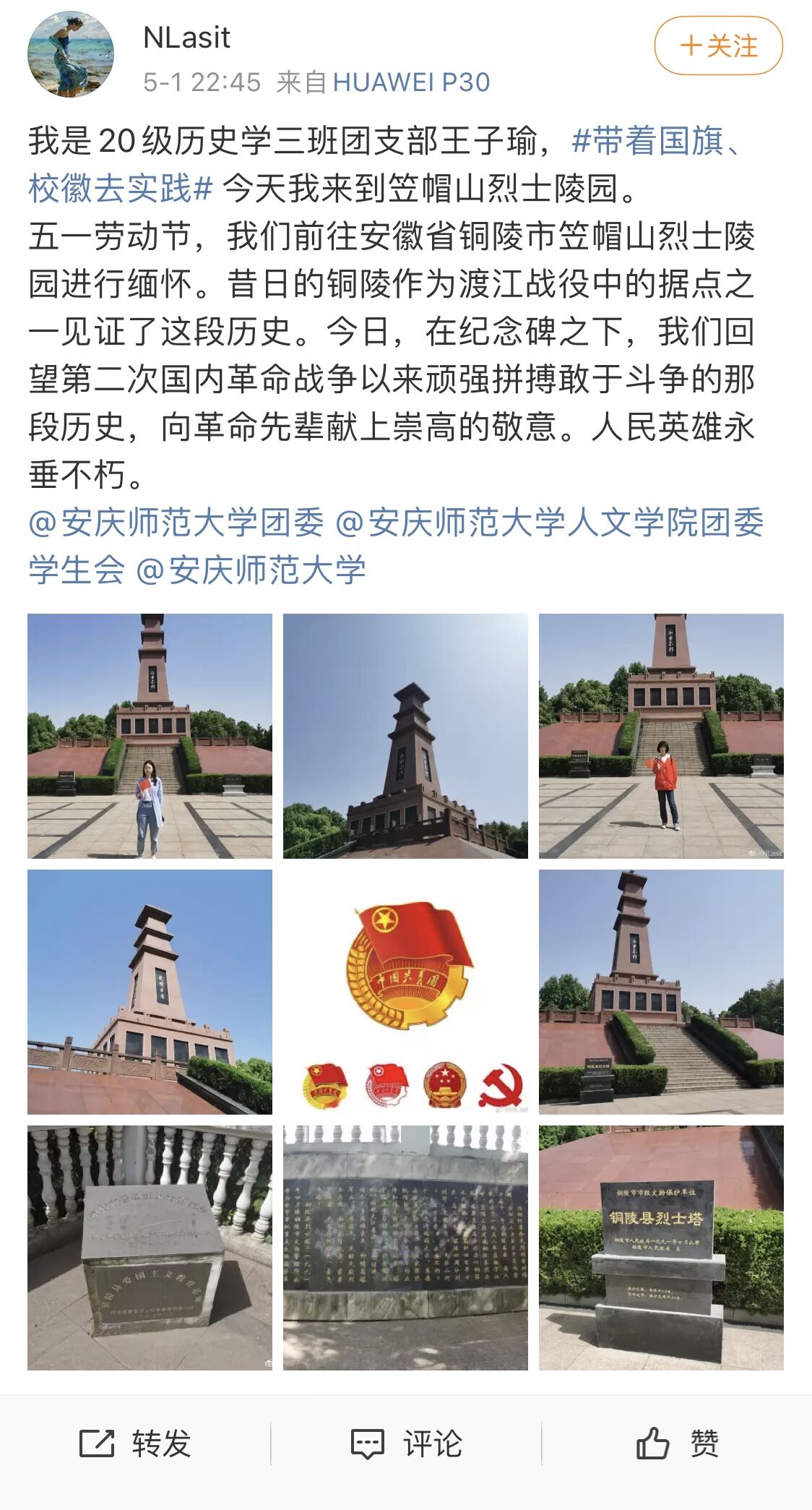 为深入开展党史学习教育,帮助青年学生增强爱党敬党意识,提升政治素养、网络素养,传播网络正能量,5月1日至5日,学院结合校团委精神的要求,开展“带着国旗、校徽去实践”图文征集活动。开云学生积极报名,踊跃参与。2019、2020级邱美玲、蔡洁、李士龙等同学自行选择黄镇生平事迹陈列馆、合肥渡江战役纪念馆等红色教育基地,佩戴校徽、团徽、学生证与国旗、团旗进行合影并写下文字感言,进行图文编辑后在新浪微博发表。