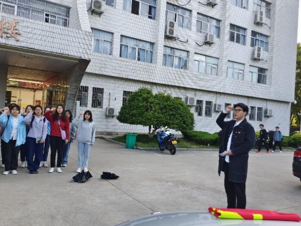 早上七点,开云kaiyun网站团委在教学楼前举行升国旗与重温入团誓词仪式。在庄严的国歌声中,五星红旗伴随着朝阳缓缓升起,2021级中国语言文学类四班全体同学伫立在国旗下,全体同学肃立,齐唱国歌,行注目礼。