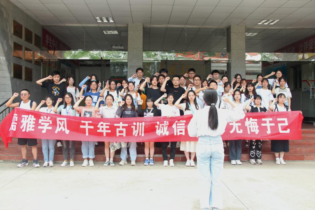 会上,学生代表2021级中国语言文学类徐斯航和曹忆凡就“诚信考试”主题发言。会后,参会同学们在教学楼前宣誓、合照。
