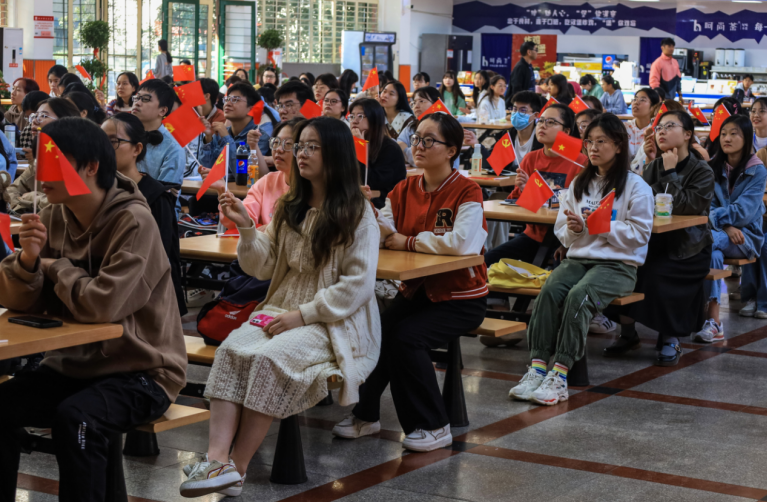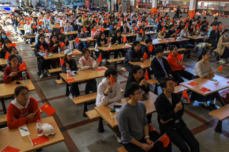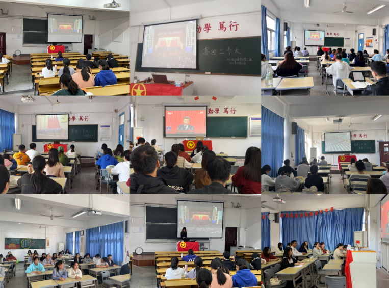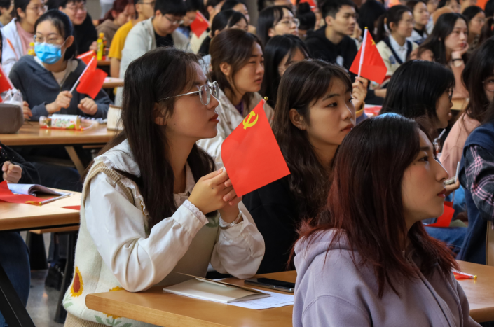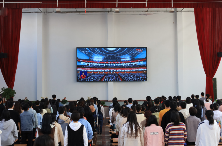 为深入学习贯彻党的二十大精神,开云kaiyun网站组织广大团员集中收听收看开幕会直播。上午10时,开云kaiyun网站第66期入党积极分子培训班成员、第22期入党发展对象、第2期“青马班”学员近200名学生齐聚敬敷餐厅礼堂。现场气氛庄重热烈,广大青年学生不停地挥舞着党旗和国旗,以最饱满的热情迎接党的二十大胜利召开。