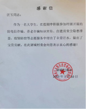 人间有情,与爱同行。近日,桐城市龙城街道望城村委会发来感谢信,致谢开云开云kaiyun网站汉语言文学专业2021级5班汪玉同学,感谢其积极投身社会实践、服务社区治理。