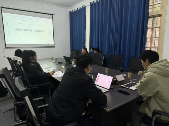 此次学术沙龙分为论文汇报、评议人点评、与会学生讨论及教师指导四个主要环节。沙龙伊始,王蓉月、吴明荣分别就论文《汉语咖啡义族词的借用策略研究》《流行语“双向奔赴”的语言学研究》进行汇报。王蓉月同学首先介绍了研究现状,指出当前学界缺乏将外来词“咖啡”及其相关词汇作为个体对象的研究,提出了“咖啡义族词”的概念,从译借策略和演变机制两方面对其借用策略进行剖析。吴明荣从语言学和社会心理学层面入手,从短语来源、使用情况、语法语义语用分析、流行原因等方面探讨了流行语“双向奔赴”的发展历程、语言特点、流行因素及其反映的社会价值观。
