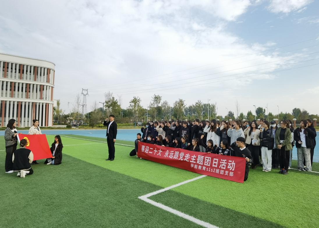 2022级学前教育专升本1、2班来到操场,在鲜艳的团旗下共同进行重温入团誓词。2022级学前教育专升本2班团支部书记徐雪寒同学在发言中表示:“要以此次学习为契机用积极向上的精神面貌,迎接党的二十大的顺利召开”。