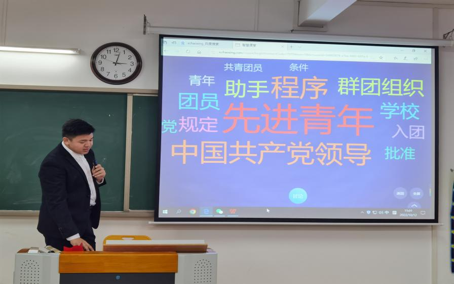 2022级学前教育专升本2班班长刘双同学进行了主题宣讲,与参会团员围绕“你认为什么是共青团员”、“新时代的共青团员应该是什么样子?”“在日常生活中共青团员做什么事”等话题展开讨论,“团员是党的助手、党的后备军、为人民服务、积极参加志愿服务”等一系列的词汇涌入大屏幕,同学们都积极表达了自己心中新时代的共青团员形象。最后,通过视频学习优秀团员的先进事例,参会团员们讲述自己参加的志愿活动等事例,给大家分享自己的亲身经历以此鼓励带动更多的人加入共产主义青年团这个集体中来。