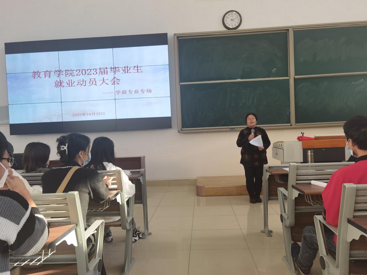 2022年10月19日下午,bat365在教学楼121教室召开2023届毕业生就业动员大会。为帮助2023届毕业生准确有效地确定就业方向,尽快地让同学们在思想、行动上早做准备,指导毕业生如何走好从大学走向社会的重要一步。bat365中文官方网站王家云院长、孟向红副书记及学前教研组老师出席本次会议,2023届bat365中文官方网站学前教育专业全体毕业生参加会议。会议分两场进行,分别由bat365中文官方网站学前教育专业辅导员任若晨、侯莉萍主持。