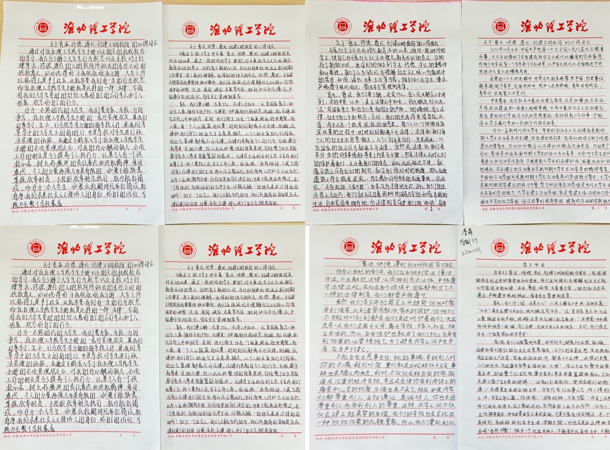 为树立当代大学生知礼守法,讲文明树新风的青春风貌,10月下旬,bat365中文官方网站要求全体学生认真手写一份不少于1000字的心得体会,并就主题做出承诺书。同学们用肃穆的文字,庄重的承诺,表示定会将法治精神落实到日常事务之中,活动成效显著。