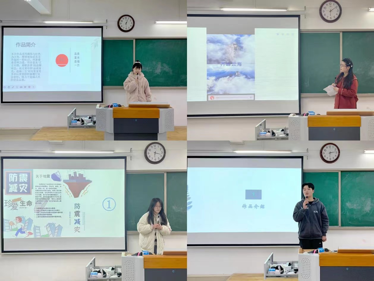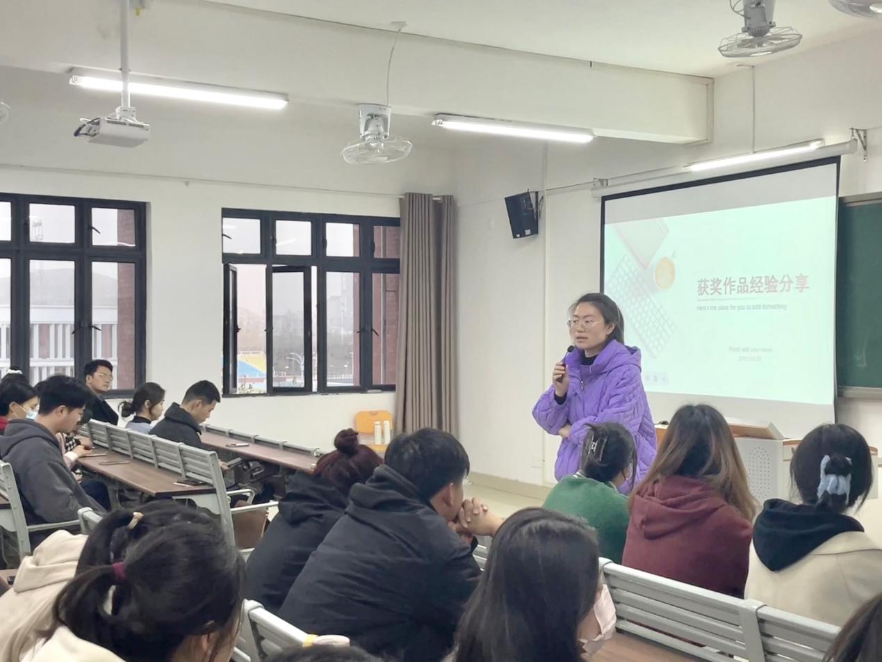 会上,四位在省级比赛中获奖的同学分别分享自己的参赛经验。21级应数3班刘婉莹和21级汉文3班郭静薇各自分享了在“安徽省第二届大学生质量文化与品牌创意设计大赛”中获奖的经验,并向同学们介绍了品牌设计的构思、方案撰写和创作方法;21级汉文5班吴宇分享了自己在“安徽省第二届大学生质量文化与品牌创意设计大赛”中获奖作品的灵感来源;21级英语二班淑娴通过展示自己在“安徽省第四届防震减灾科普作品征集大赛”中的获奖作品,介绍了自己的创作思路并推荐了制作软件。最后,由社会实践部部长陈娴雅介绍各类省级赛事的参赛时间节点和各项具体流程,为同学们报名参加比赛提供了信息渠道。