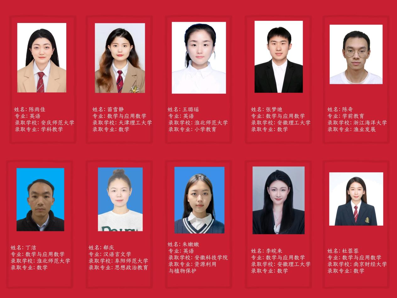 丁洁,2021级数学与应用数学专升本2班,总成绩第三考取淮北师范大学,数学科学学院,数学(概率论与数理统计专业)专业。
