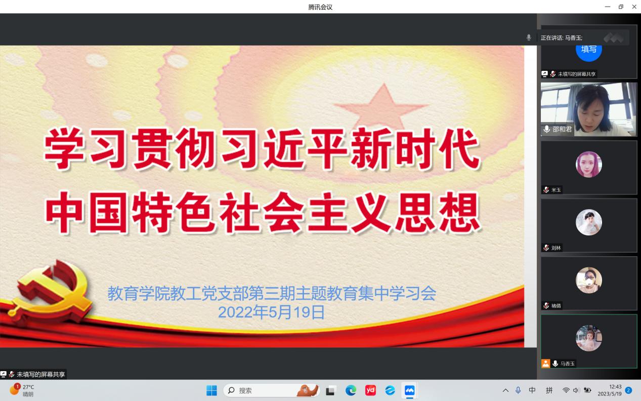 5月19日下午,bat365中文官方网站学习贯彻习近平新时代中国特色社会主义思想主题教育开展第三期读书班党课学习,本次学习会以“线上课堂”形式举行,由教工党支部委员邵和君同志主持并领学。