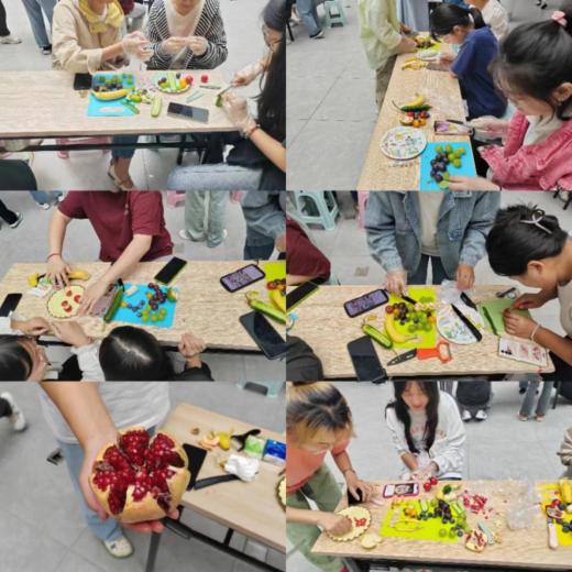 参加本次比赛的共有各班级组成的20支队伍。活动过程中,果香四溢,热闹非凡,同学们沉浸在自己的创作中,各组分工明确,切水果、剥果肉、摆造型。有的队伍将一根细长的黄瓜切出一朵花的形状;有的队伍将椭圆的圣女果分成几份,拼接成兔子的模样;还有的则用石榴摆成中秋二字,小小的拼盘里蕴含着无限的创意。