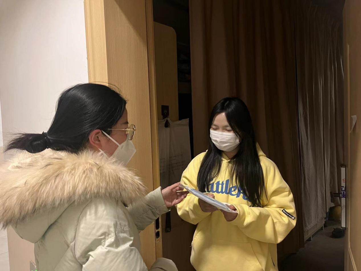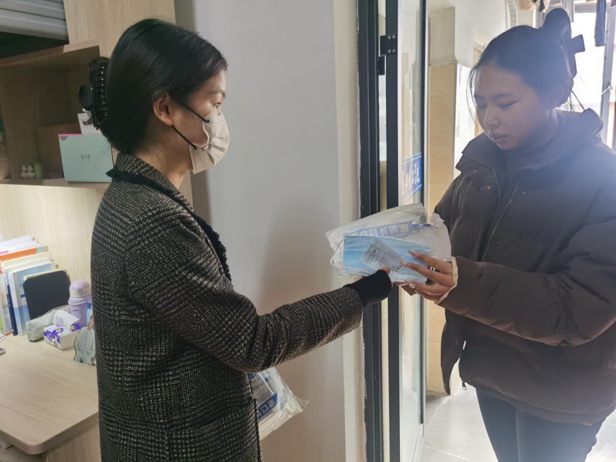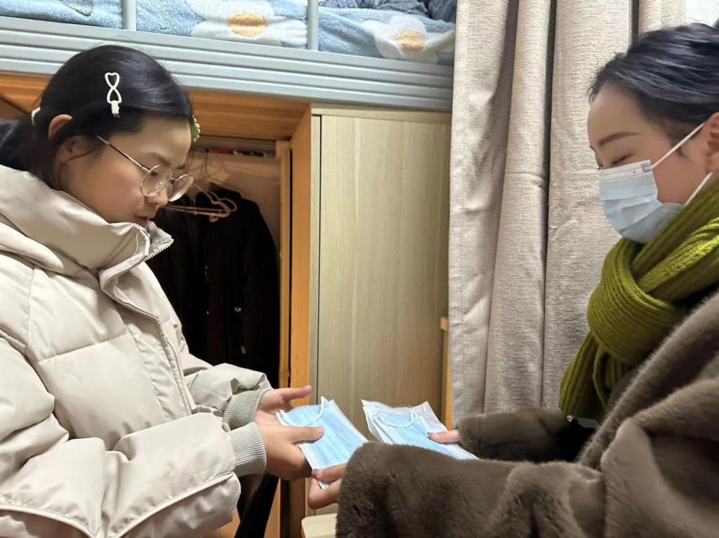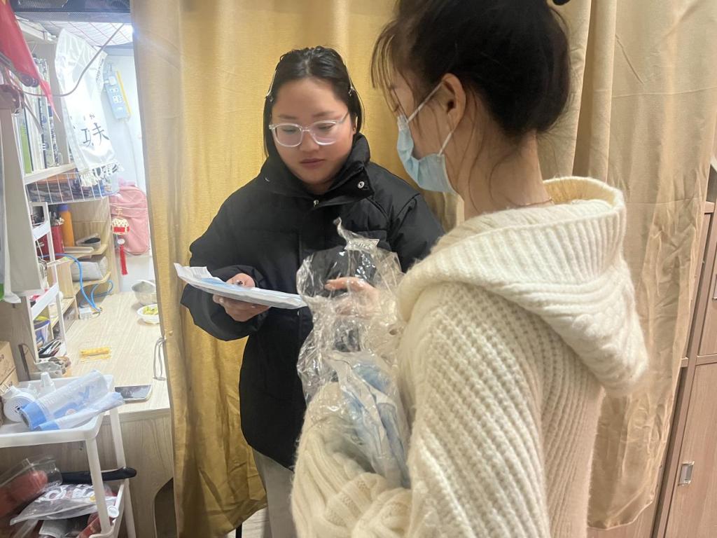 老师们在检查走访中对宿舍安全卫生不足的寝室进行了善意的提醒和指导,还特意向同学们宣传了预防流感等呼吸道感染方面的知识,提醒各位同学要及时对宿舍进行通风,减少传染性疾病传播的可能,同时,辅导员也看望了因流感发烧请假的学生,并为他们带来口罩和消毒水,给予亲切问候。