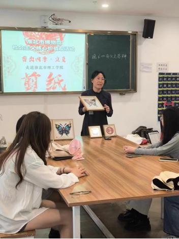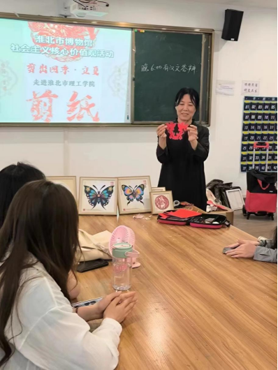 活动中博物馆工作人员向同学们详细介绍了“剪纸”作为中华非物质文化遗产的演变过程,“剪纸”创作的基本要领,展示了精美的剪纸作品,带领同学们对一些剪纸形式进行了赏析,同学们认真聆听,积极与老师互动交流。