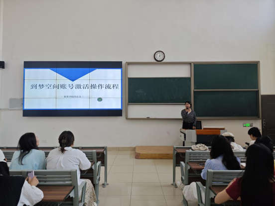 随后,院学生会办公室部门张蕊同学向大家介绍了到梦空间第二课堂账号激活操作流程。她详细介绍了激活步骤,帮助班委熟悉操作方法,并强调了学会使用“到梦空间”将有助于查找并参与校、院两级活动,带领班级积极主动完成学分修订。