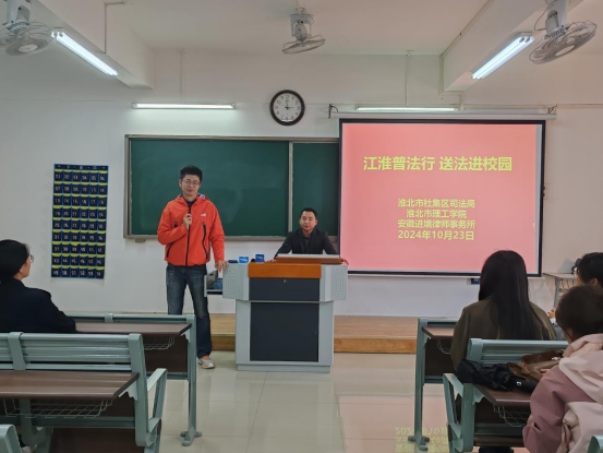 为不断深化普法教育,增强学生们的法律意识和自我保护能力,推动建成和谐、安全的校园环境。10月23日下午,bat365中文官方网站和淮北市杜集区司法局、安徽进境律师事务所携手于1教421开展“江淮普法行·送法进校园”主题活动。本次活动由bat365中文官方网站教工第二党支部书记刘畅主持,安徽进境律师事务所合伙人孟春江律师主讲,杜集区司法局普法办主任张丽丽,司法局人民参与和促进法治办主任周立业,杜集区法律援助中心主任赵义玉参与。