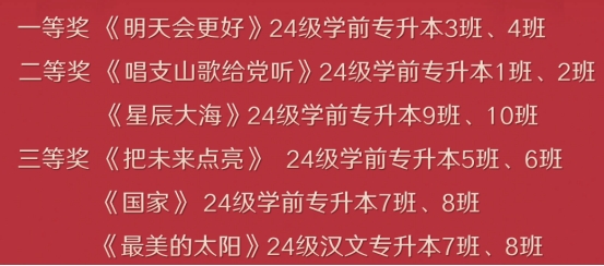 陈博识老师以“歌曲串烧:那些年+直到世界尽头”为合唱比赛正式拉开帷幕。随着旋律的层层递进,17支合唱队伍着装整齐,以炽热的深情、饱满激昂的歌声回顾党的光辉历程,共同唱响时代主旋律。《强军战歌》《渴望光辉》《最美的太阳》《爱我中华》《大中国》《把未来点亮》《万疆》《夜空中最亮的星》《唱支山歌给党听》《我爱你中国》《我和我的祖国》《星辰大海》《明天会更好》《少年中国说》《灯火里的中国》《如愿》《国家》)等耳熟能详、气势磅礴、雄浑激昂的红色歌曲轮番上演,唱出了对党和祖国深深的热爱之情,为现场观众带来了一场赏心悦目的视听盛宴。