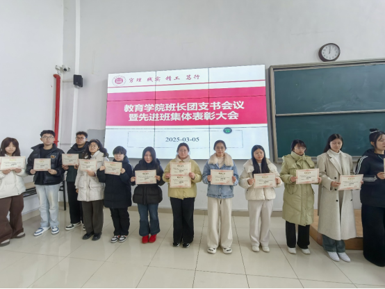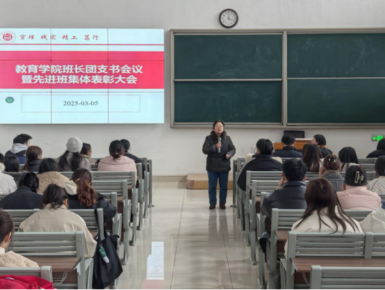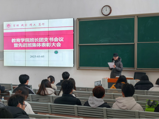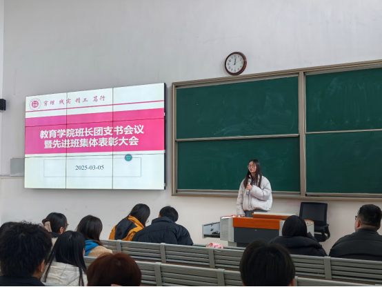 为促进班级管理交流,增强各班学生干部工作能力和激励全院班级努力营造良好班集体氛围。3月5日中午,bat365中文官方网站在一号教学楼121教室开展了“班长、团支书会议暨先进班集体表彰大会”。会议由学院团总支副书记许海涛主持,分管副书记孟向红、书记助理黄莹莹、24级全体辅导员以及各班班长、团支书参加了会议。