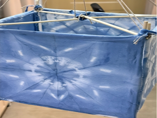 7月14日当天,实践队以“非遗+红色文化”为核心理念,开创性地将布艺与扎染技艺结合,赋予传统工艺新时代内涵。队员们聚焦淮海战役“小推车精神”,探索出系统化的红色主题创作路径,在非遗扎染传承人张雨露老师的带领下,队员们将学习到的布艺技巧运用于扎染中,在棉麻织物上运用缝、绣、拼等布艺手法,精心构筑手绘线条,形成独特的防染“纹样骨架”。随后,张雨露老师运用蓝印花工艺,通过反复浸染、套色,并巧妙结合折叠、捆扎、夹板等技法,实现色彩的渐变与肌理的碰撞。经过十余次实验攻关,团队成功摸索出“线性扎染”新技法—利用缝线轨迹精准控制染色边界,使规整的线条与自然的染料晕染完美交融。