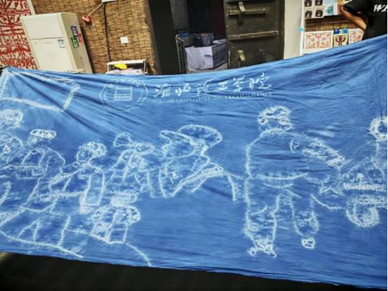 最后一天,实践队决定将红色文化与学到的布艺和扎染知识相融合,共同缝制一幅传承民族生生不息的精神大型扎染作品。队员们分工合作,先仔细将画面轮廓勾勒在布上,再一丝不苟地用针线把线条覆盖,随后将作品浸入染缸一天一夜,等待作品最终的亮相。经过数日的努力,一幅承载着“军民同心、众志成城”红色精神的扎染作品终于完成,成为了此次“三下乡”活动中最有意义的成果之一。