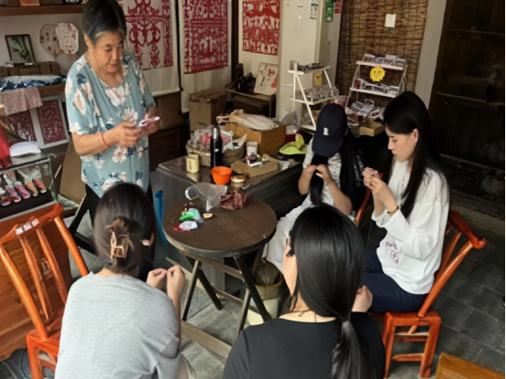 下午,实践队在省级布艺传承人丁兰云老师的带领下,开启了布艺探索之旅。丁老师以生动语言,深入浅出地讲解了布艺的历史脉络、专业针法与制作精髓。“针脚要像运河的水,既要有力量,又要留出呼吸的空间。”丁老师形象的点拨激发了队员们的浓厚兴趣。队员们热情高涨,虚心求教,通过亲身体验一针一线的缝制过程,深刻感受到布艺这门民间工艺所承载的农耕文明智慧与生活美学。同时,丁老师创新性地将濉溪“石榴小镇”、淮海战役“小推车精神”及“石板街”历史元素融入布艺创作,细密的针脚在她手中幻化成立体小花,为传统技艺注入时代新意,这正是对非遗文化的传承与创新,在一针一线的坚守中,传统布艺正以更鲜活的姿态,走进当代生活。