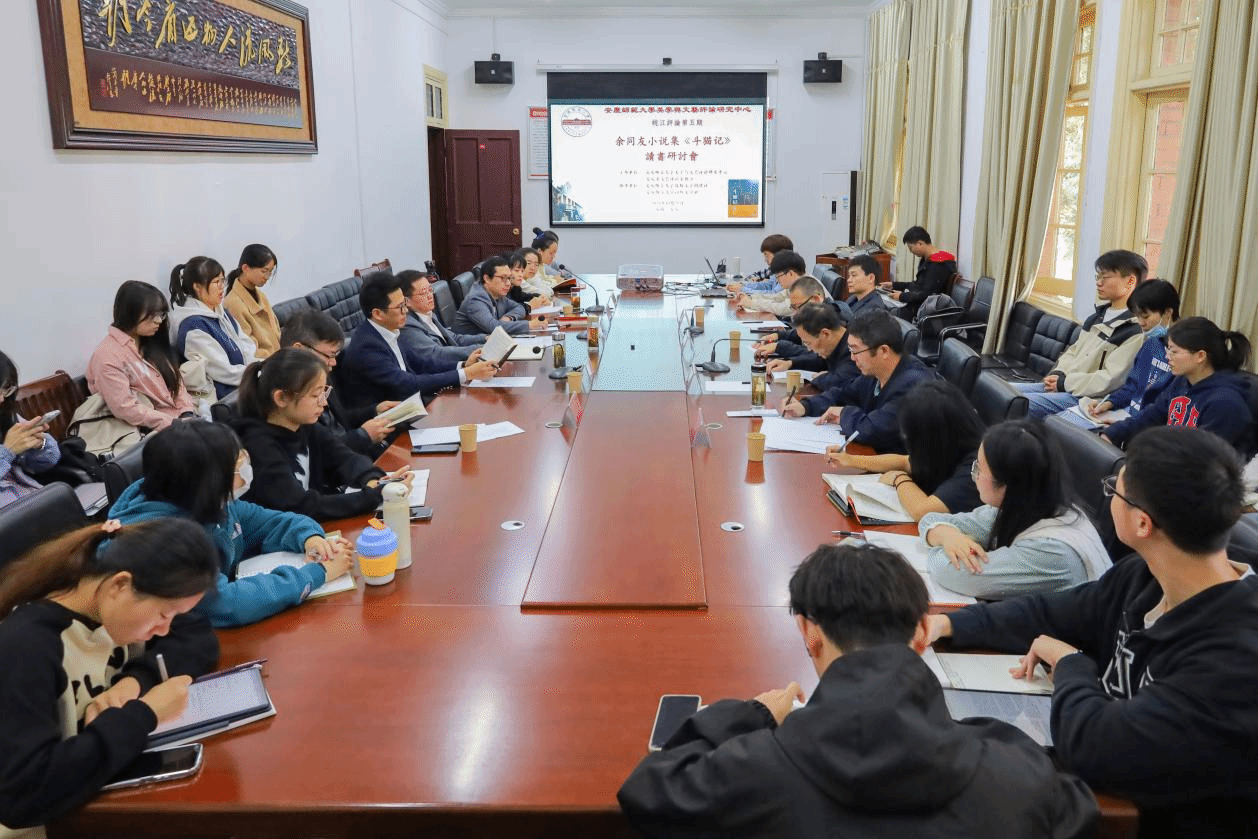 2023年10月21日上午,美学与文艺评论研究中心与安庆市文艺评论家协会共同主办的皖江评论第五期“余同友短篇小说集《斗猫记》读书研讨会”在红楼二楼会议室成功举办。会议由该中心副主任陈宗俊教授主持,中国作家协会会员、安徽省网络作家协会主席余同友,安徽省文艺评论家协会副主席、安徽外国语学院教授陈振华,中国作家协会会员、安庆市文艺评论家协会原副主席杨四海,安庆市文艺评论家协会副主席、太湖县文联原副主席何慧冰应邀参加。中心主任江飞教授,研究员冯慧敏、徐先智,以及开云kaiyun网站中国现当代文学专业、文艺学专业部分硕士研究生、本科生等近30人参与了此次研讨会。