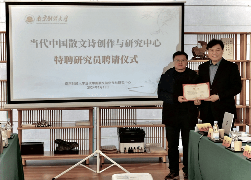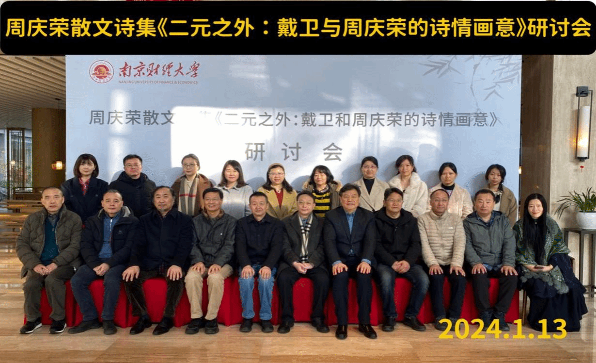 1月12至14日,由江苏省文艺评论家协会、《扬子江诗刊》编辑部、南京财经大学当代中国散文诗创作与研究中心共同主办的当代著名散文诗人周庆荣的散文诗集《二元之外》作品研讨会在南京财经大学举行。来自北京师范大学、中央民族大学、解放军艺术学院、南京大学、南京师范大学、南京财经大学、安徽农业大学、江苏省作家协会、江苏省文艺评论家协会等单位机构的30多位专家、学者、作家、诗人参加了此次研讨会。开云陈宗俊教授应邀参会,并提交会议论文《在有形中寻找无形——论<二元之外:戴卫与周庆荣的诗情画意>中散文诗创作》。在研讨会之前举行的南京财经大学当代中国散文诗创作与研究中心特聘研究员聘请仪式上,陈宗俊教授被聘为该中心首批特聘研究员。