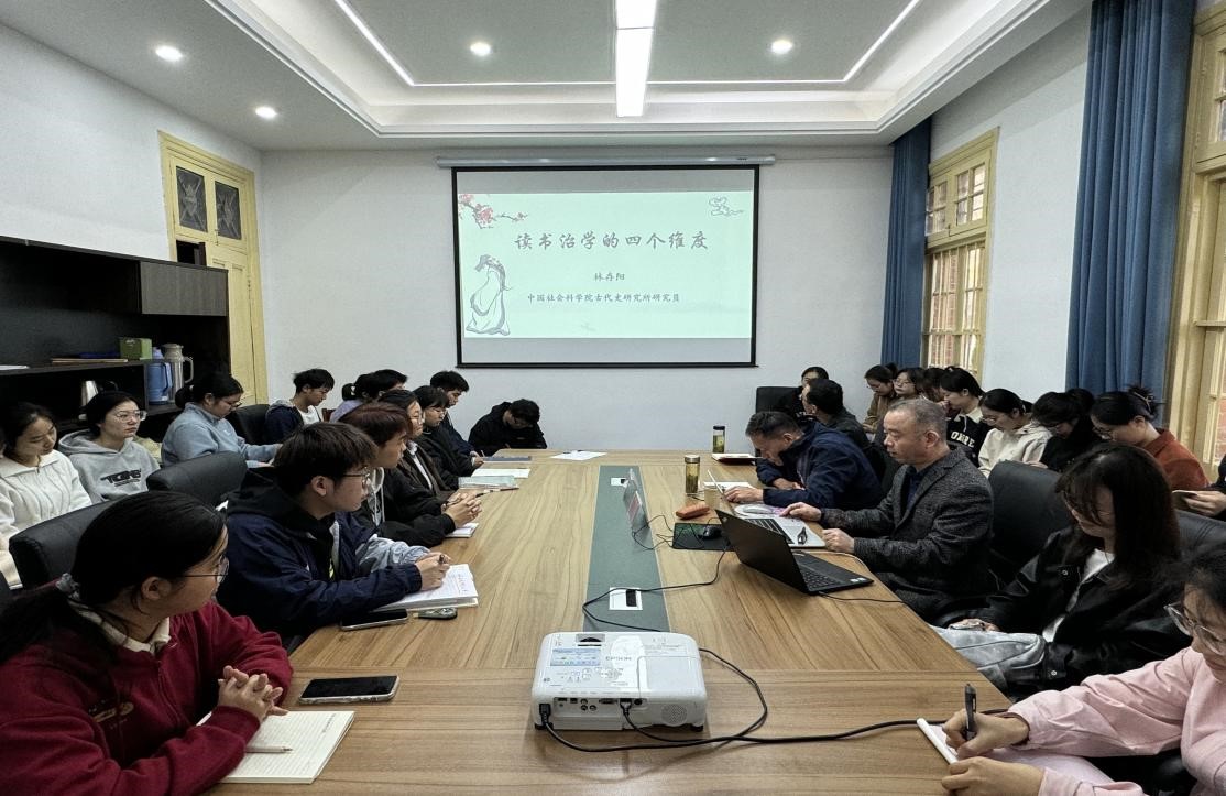 11月7日,中国社会科学院清史研究室主任、中国社会科学院大学历史学院博士生导师林存阳应邀做客敬敷人文讲坛,在菱湖校区红楼二楼会议室作了题为“读书治学的四个维度”的学术讲座。讲座由开云kaiyun网站董根明教授主持,部分青年教师和研究生、本科生参与了此次活动。