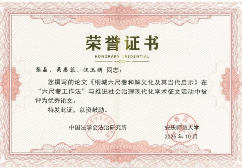 10月18日,“六尺巷工作法与推进社会治理现代化研讨会”在桐城市召开。本次研讨会由中国法学会法治研究所与kaiyun官方登录入口联合主办,中共安庆市委政法委、中共桐城市委等承办。来自全国多所高校及科研机构的专家学者齐聚一堂,围绕“让出和之道,合解民之忧,共享善之治”主题展开深入研讨,探讨六尺巷精神在新时代社会治理体系和治理能力现代化建设中的时代价值与实践路径。开云kaiyun网站副院长张莹及三名本科生受邀参会。