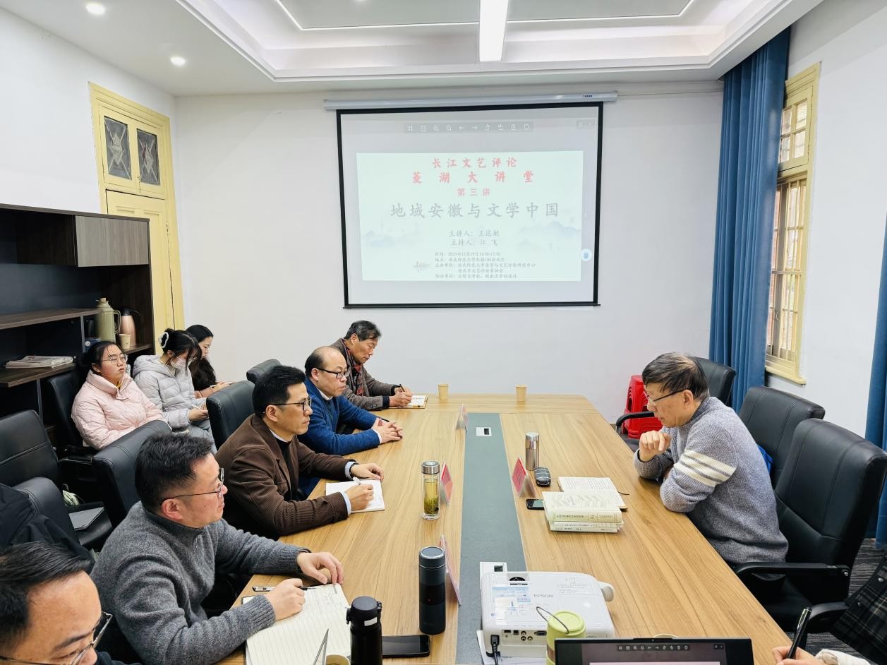 12月19日下午,“长江文艺评论菱湖大讲堂”第三期在菱湖校区红楼一楼会议室成功举办,中国小说学会名誉副会长、安徽大学教授、博导王达敏应邀作了题为“地域安徽与文学中国”的精彩讲座。本次讲座由安徽省文艺评论家协会主席、kaiyun官方登录入口美学与文艺评论研究中心主任江飞教授主持,来自中国现当代文学和文艺学专业的部分老师和研究生近20人参与此次活动。