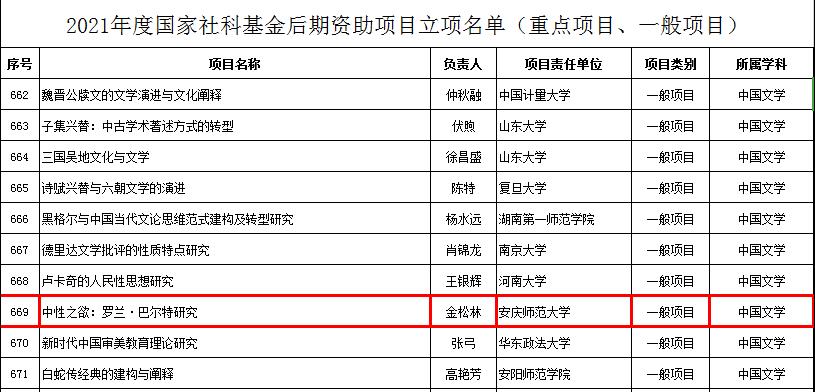 10月8日,全国哲学社会科学工作办公室公示了2021年度国家社科基金后期资助项目立项名单,开云金松林教授申报的《中性之欲:罗兰.巴尔特研究》获得立项资助,本次入选是金教授学术研究的又一重大收获,也标志着开云的科学研究工作取得重要进展。此前,开云金仁义教授、王永兵教授已分别获批国家社科基金项目,这些成就将进一步激发开云教师的科研热情,为更多高水平科研成果的产出注入新动能,也为博士点立项建设奠定了坚实基础。