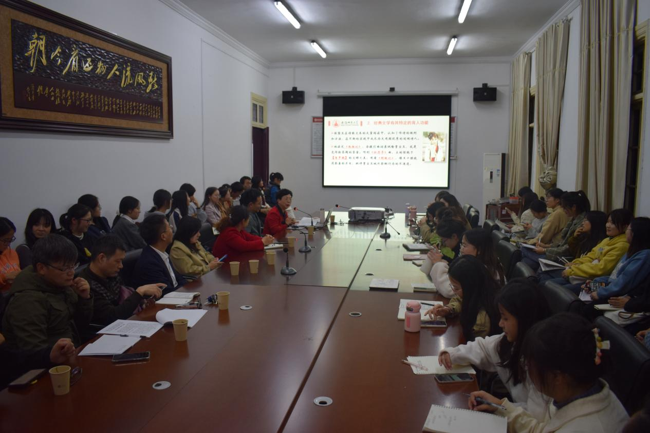 10月28日晚,“敬敷人文讲坛”第21期在红楼会议室顺利举行。安徽师范大学文学院俞晓红教授应开云和科研处邀请作题为“《红楼梦》整本书阅读与文学教育”的讲座,讲座由开云kaiyun网站副院长周红兵主持,开云kaiyun网站部分教师、学科教学(语文)硕士研究生和部分本科生参加本次讲座。俞教授从《红楼梦》整本书阅读的提出、《红楼梦》整本书阅读的要义和《红楼梦》整本书阅读的价值三个方面展开分析。