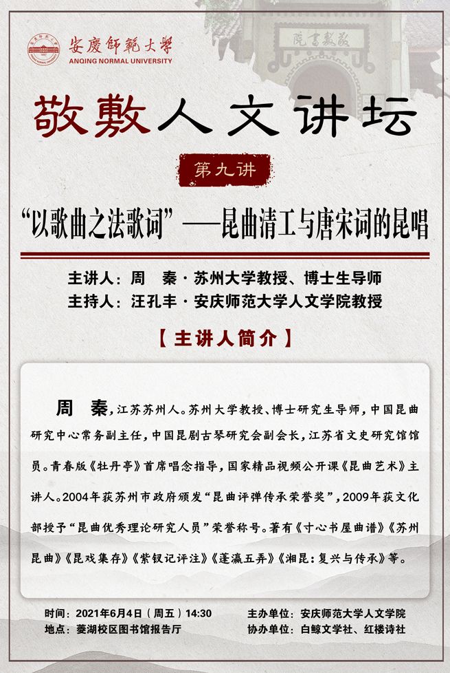 【敬敷人文讲坛⑨】昆曲清工与唐宋词的昆唱