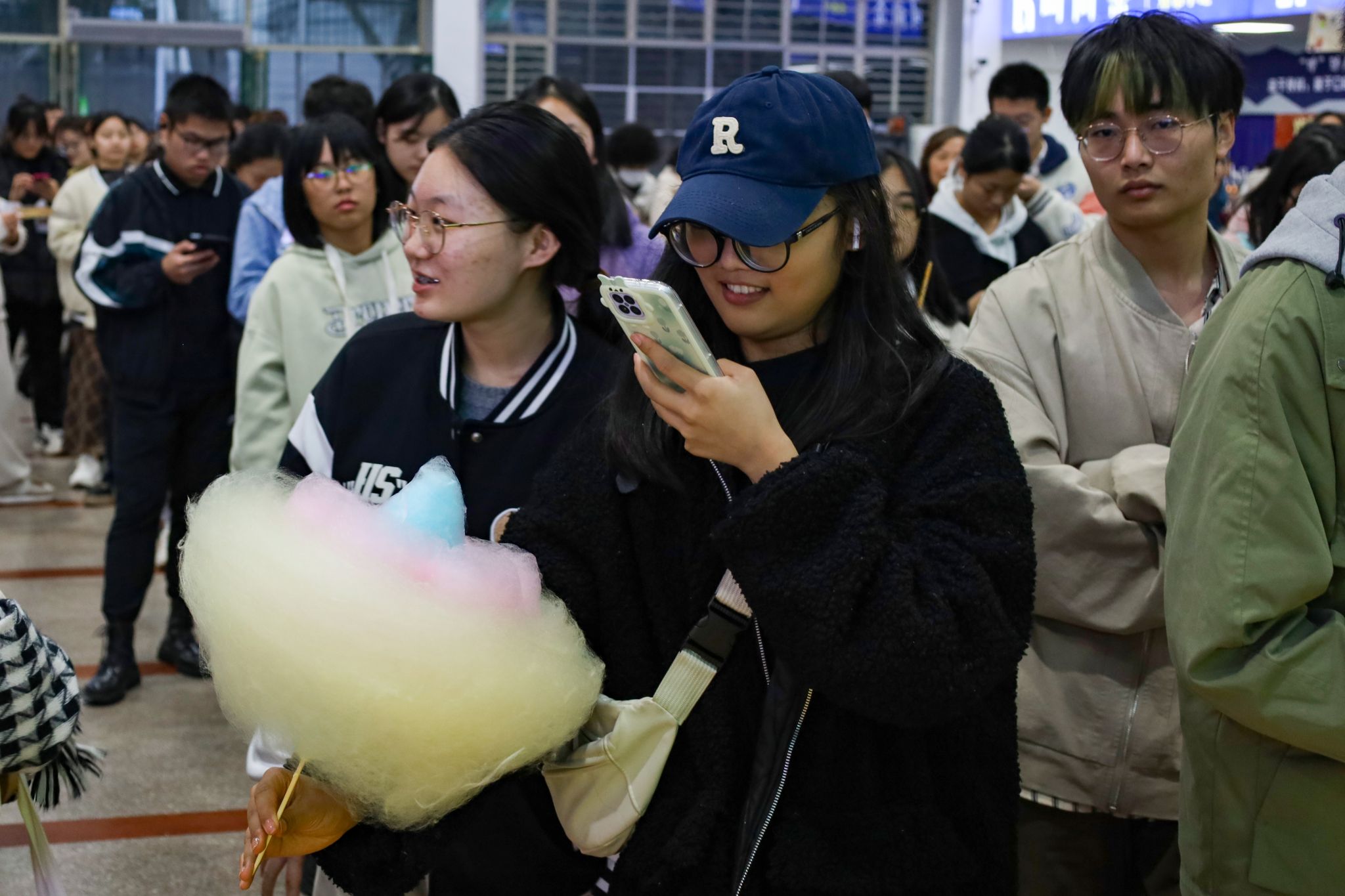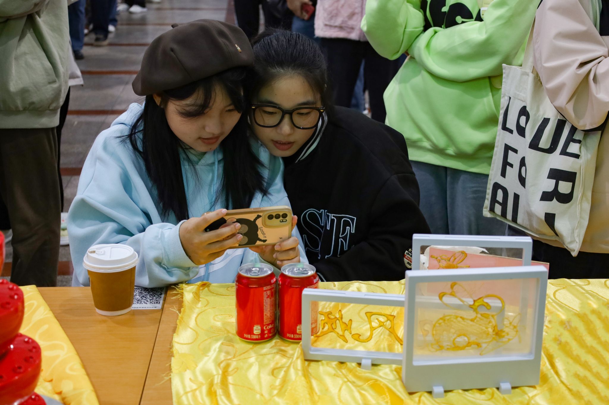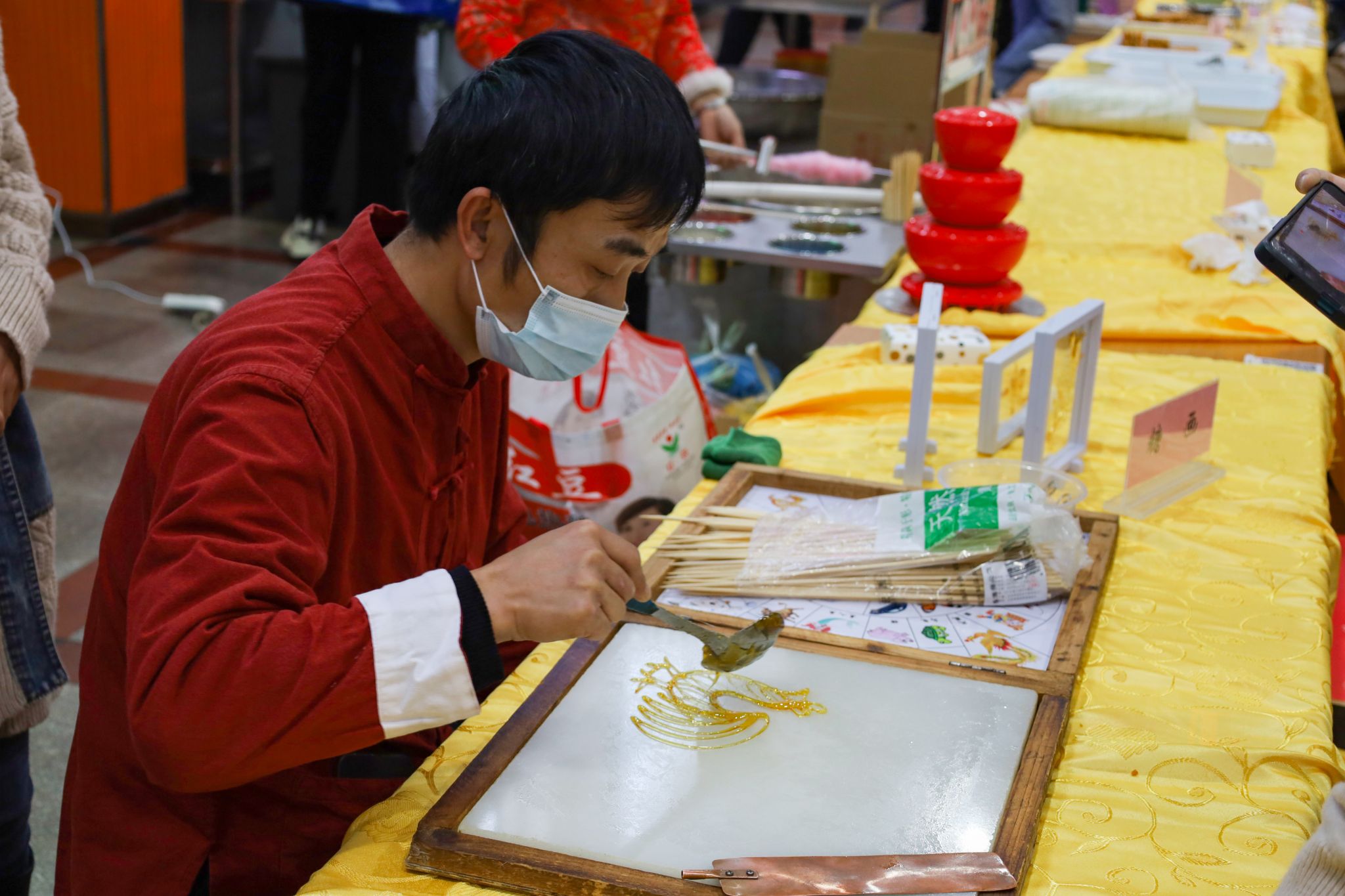 拉面、糖画等中国传统非遗美食成功刷屏了在场师生的朋友圈,成为现场的一大亮点。糖画师傅早早地熬好糖浆,缕缕金黄糖丝自汤勺中泄下,随着师傅快速地移动手肘,一只栩栩如生打鸣的公鸡便在他手下诞生。负责制作棉花糖的阿姨也在准备中,各色的棉花糖自炉中跳出,阿姨手握一根竹签,在炉内转动,一只彩色小兔便已成形。拉面师傅表演着独家绝技,只见胖墩墩的面团在他的双手中上下舞动拉扯,变成了细长的面条,下入锅中,袅袅白雾给寒冬中开云kaiyun网站的学子送去“温暖”。